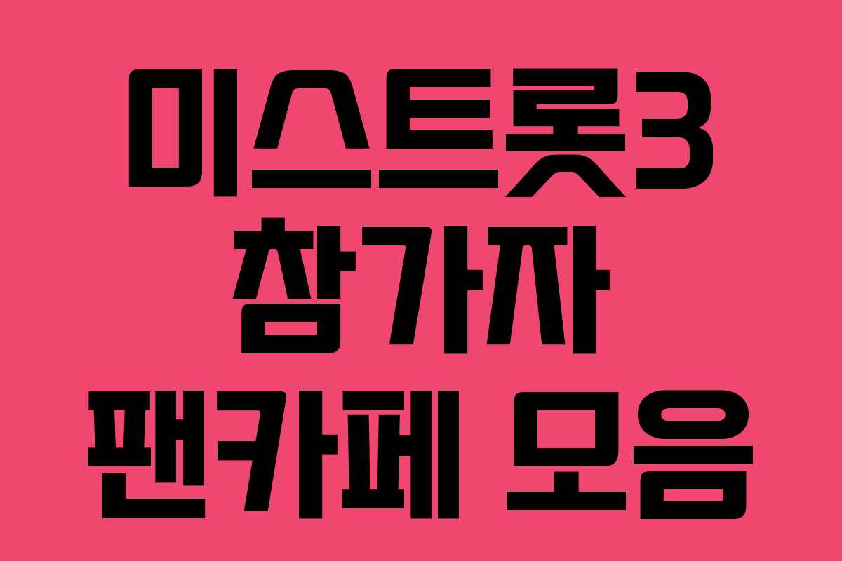 미스트롯3는 현재 실시간 방송 시청률 1위를 기록하며 많은 관심을 받고 있습니다. 이 프로그램에 참가한 가수들의 팬들도 급속히 늘어나고 있으며, 팬카페의 활성화가 두드러집니다. 이번 포스팅에서는 미스트롯3의 주요 참가자들을 위한 팬카페 정보를 정리해보았습니다. 각 팬카페에 가입하여 응원하고 소통해보세요.