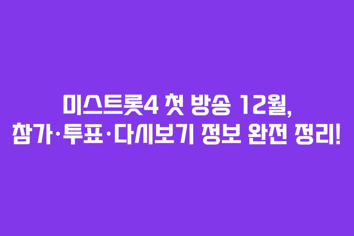 2025년 겨울, ‘미스트롯 4’가 드디어 첫 방송을 앞두고 있습니다. 이번 시즌은 역대급 참가자와 경쟁으로 많은 기대를 모으고 있습니다. 첫 방송은 12월 17일 전후로 예정되어 있으며, 트로트 팬들은 이를 손꼽아 기다리고 있습니다.