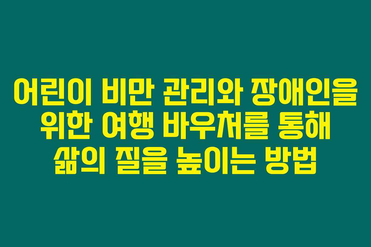 제가 알아본 바로는, 어린이 비만 관리와 장애인 여행 바우처는 우리 사회가 제공하는 중요한 복지 서비스입니다. 이러한 서비스들은 어린이들과 장애인들이 건강한 삶을 누릴 수 있도록 돕는 다양한 지원을 제공합니다. 아래를 읽어보시면 이 서비스들이 어떻게 여러분의 삶에 긍정적인 영향을 미칠 수 있는지 알 수 있습니다.