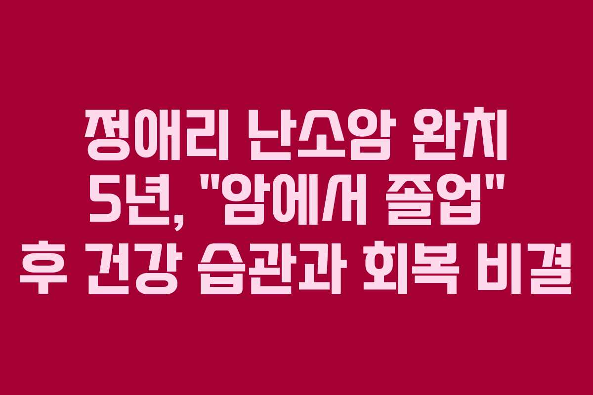 배우 정애리 씨는 난소암 투병을 극복하고 완치 5년을 맞이하며 기쁜 소식을 전했습니다. 그녀의 회복 과정과 새로운 건강 습관은 많은 암 생존자들에게 희망을 주고 있습니다. 이번 글에서는 정애리 씨가 어떻게 건강을 되찾았는지, 그녀의 핵심 건강 관리 루틴을 살펴보겠습니다.