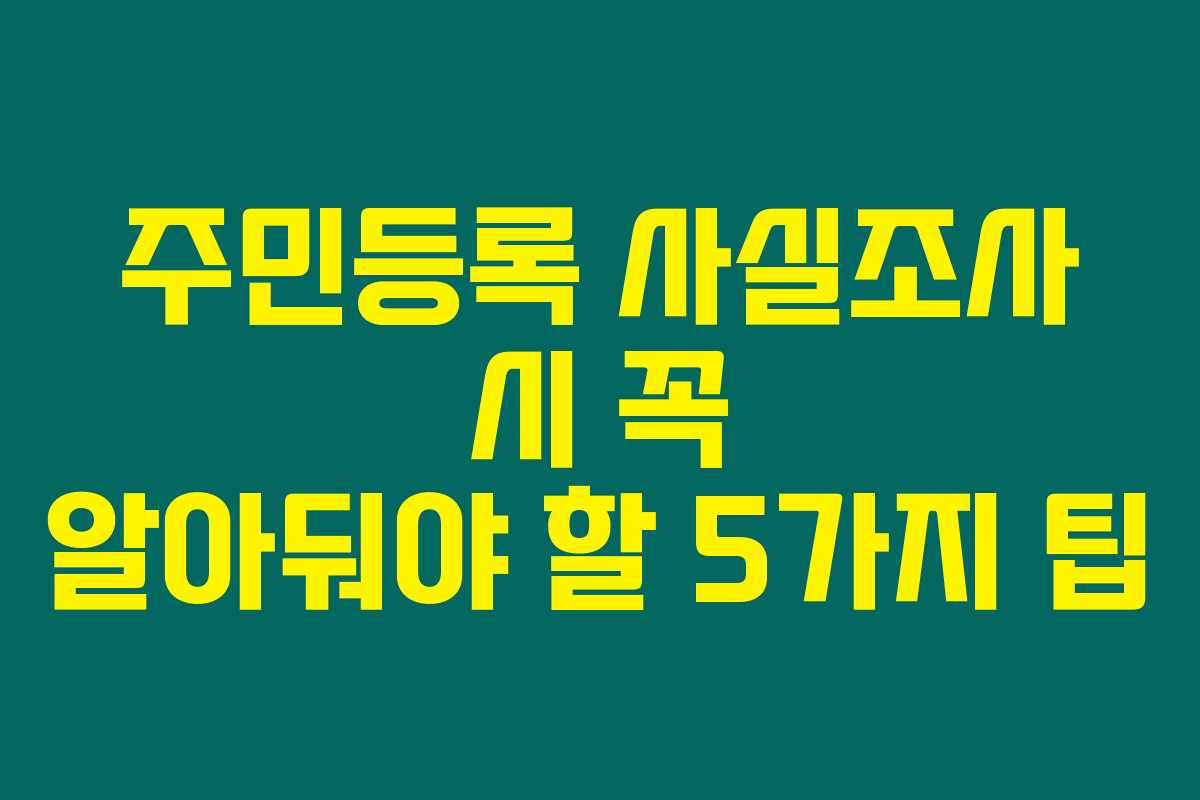 주민등록 사실조사를 위해 방문 조사원이 찾아온다면 어떻게 대처해야 할까요? 본 article에서는 주민등록 사실조사가 무엇인지 그 중요성과 함께 방문 조사원과의 안전한 면접을 위한 유용한 팁을 제공해 드립니다. 주민등록 사실조사를 받고 싶지 않다면, 아래를 읽어보세요. 확실히 알고 준비하는 것이 중요하답니다.