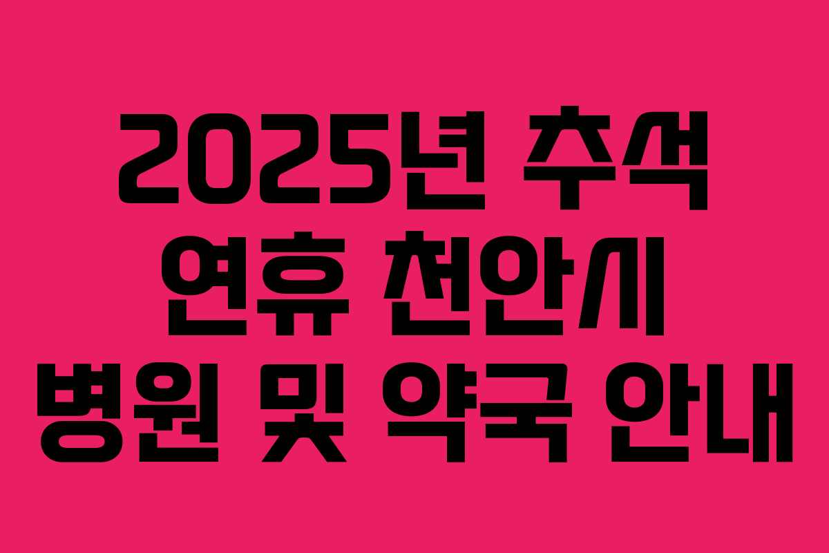 2025년 추석 연휴는 10월 3일부터 9일까지 7일간 진행됩니다. 이 긴 연휴 동안에 응급 상황에 대비할 수 있도록 천안 지역의 병원, 약국, 응급 의료기관에 대한 정보를 정리했습니다.